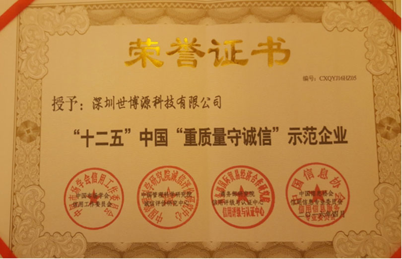 深圳世博源科技有限公司榮獲“十二五”中國“重質(zhì)量守誠信”示范企業(yè)